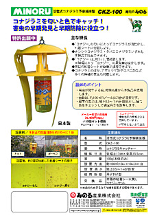 CKZ-100はオンシツコナジラミ・タバココナジラミ等を植物由来の芳香成分「コナジー」でおびき寄 せ、シートで捕虫。有効面積は1 台あたり100 ㎡。CLF-510はLED、紫外線でコナジラミ、ハモグリバエ等をおびき寄せファンで吸引捕獲。